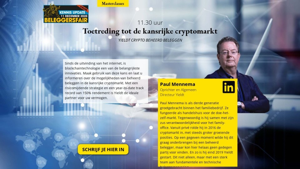 Sinds de uitvinding van het internet, is blockchaintechnologie een van de belangrijkste innovaties. Maak gebruik van deze kans en laat u informeren over de mogelijkheden van beheerd beleggen in de kansrijke cryptomarkt. Met een risicomijdende strategie en een year-to-date track record van 150% rendement is Yieldt de ideale partner voor uw vermogen.
