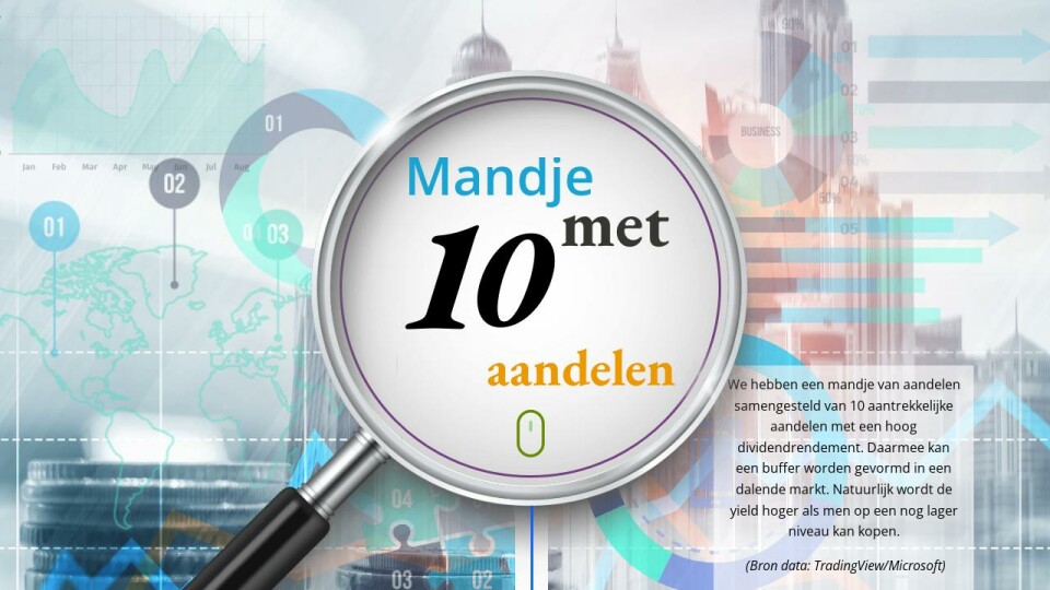 We hebben een mandje van aandelen samengesteld van 10 aantrekkelijke aandelen met een hoog dividendrendement. Daarmee kan een buffer worden gevormd in een dalende markt. Natuurlijk wordt de yield hoger als men op een nog lager niveau kan kopen.