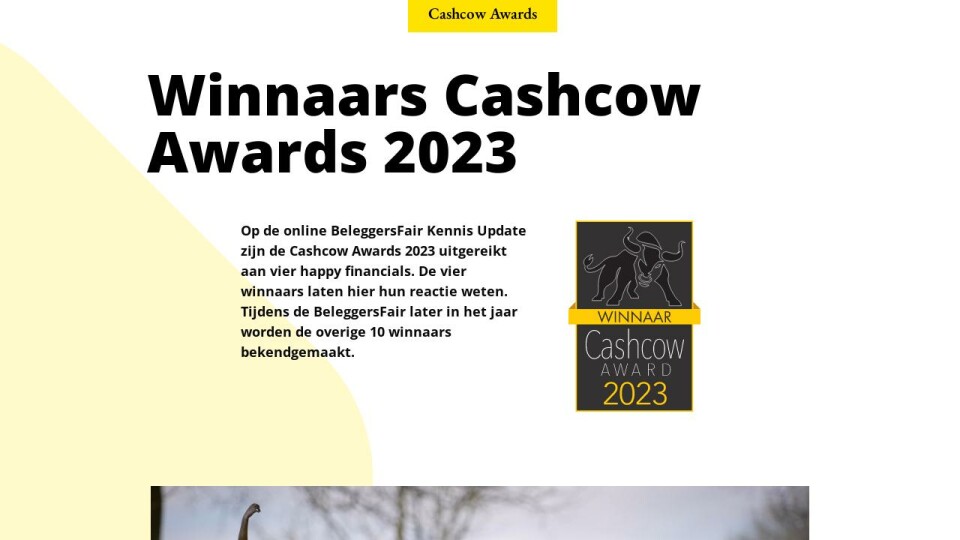 Op de online BeleggersFair Kennis Update zijn de Cashcow Awards 2023 uitgereikt aan vier happy financials. De vier winnaars laten hier hun reactie weten. Tijdens de BeleggersFair later in het jaar worden de overige 10 winnaars bekendgemaakt.
